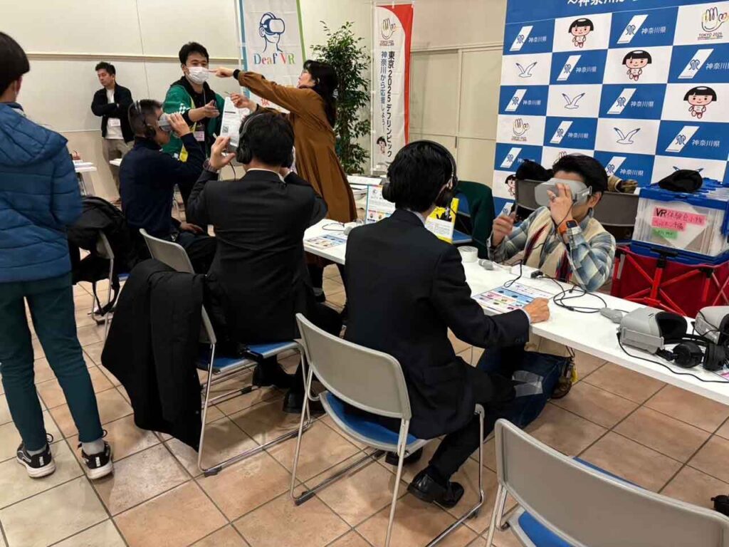 分かりやすくデフリンピックの魅力をお伝えする「デフスポーツ紙芝居SHOW」、デフ陸上のスタートランプ体験(協力:神奈川県スポーツ課)、ともに生きる社会かながわ憲章の紹介(協力:神奈川県共生推進本部室)、きこえない・きこえにくい状態を体験するVR体験会(協力:公益財団法人日本財団)、手話言語体験等を実施しました。